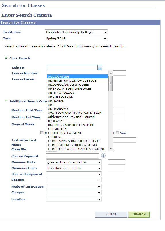 Additional search criteria is available to refine your search for a specific class.