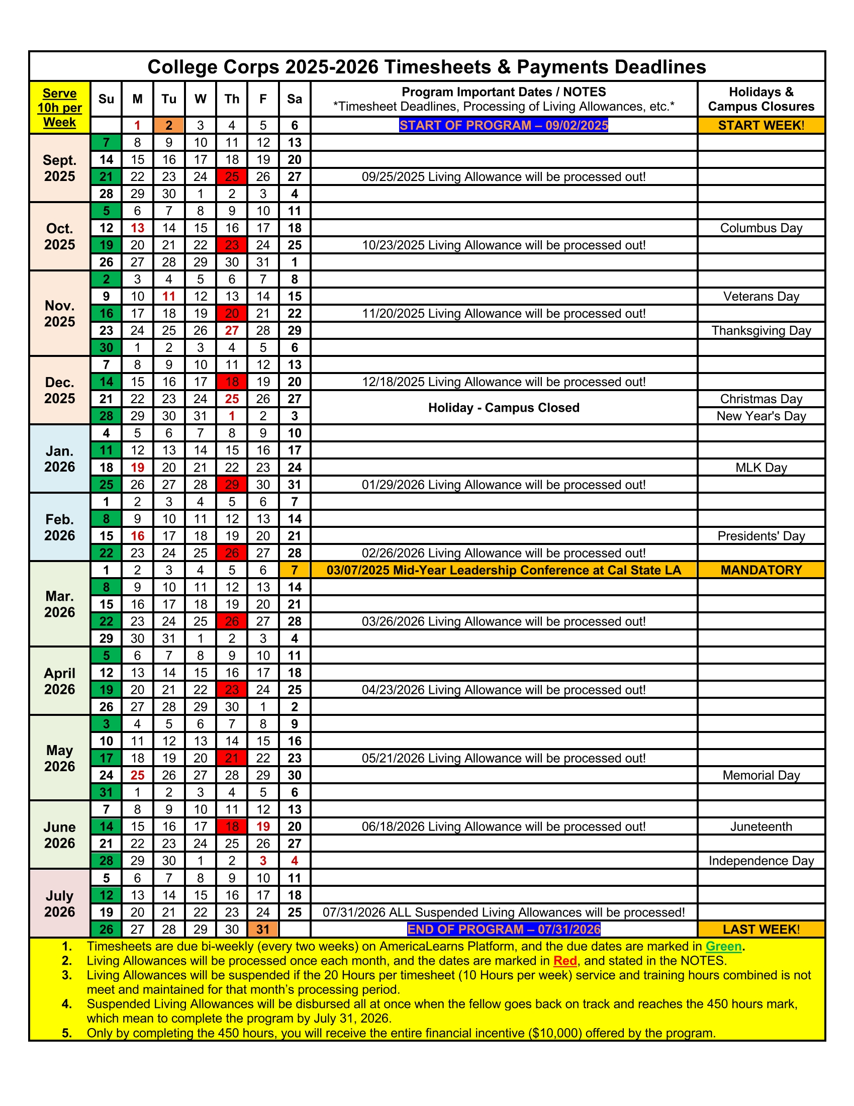 (*NOTE* the calendar below provides the deadlines related to timesheets & living allowance processing dates for Cohort 4. Visit the College Corps CANVAS page for detailed updates for all "College Corps 2025-2026" related updates!)